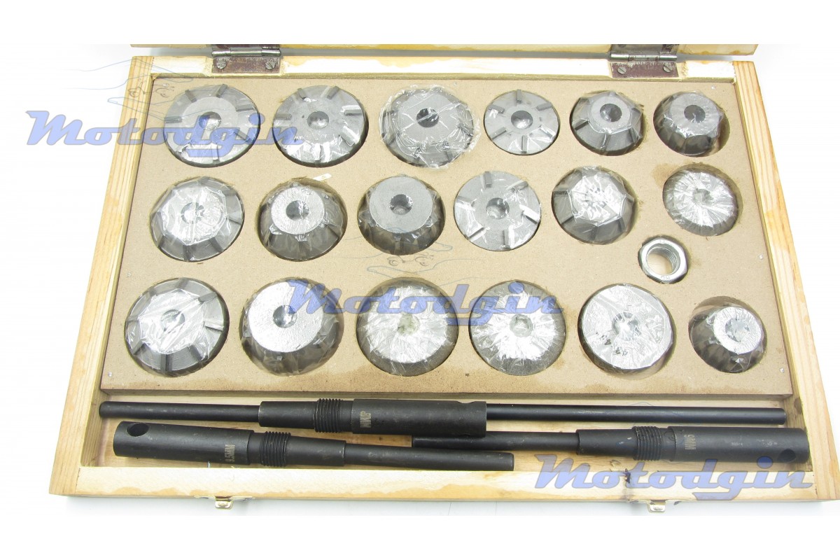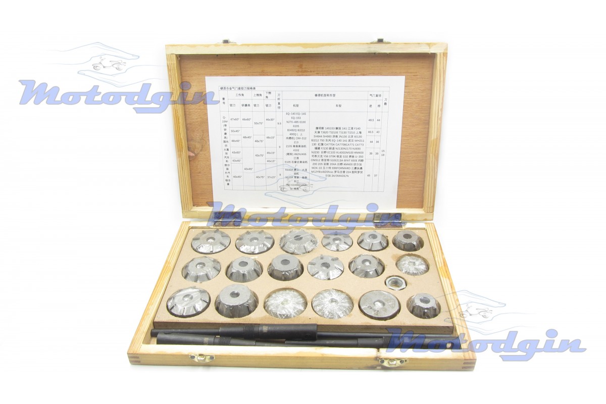 Набор шарошек в деревяном кейсе для ремонта седла клапана, комплект включает в себя восемнадцать шарошек, три пилота диаметром 8.0мм, 9.0мм, 9.50мм, вороток. Производитель - китай MG