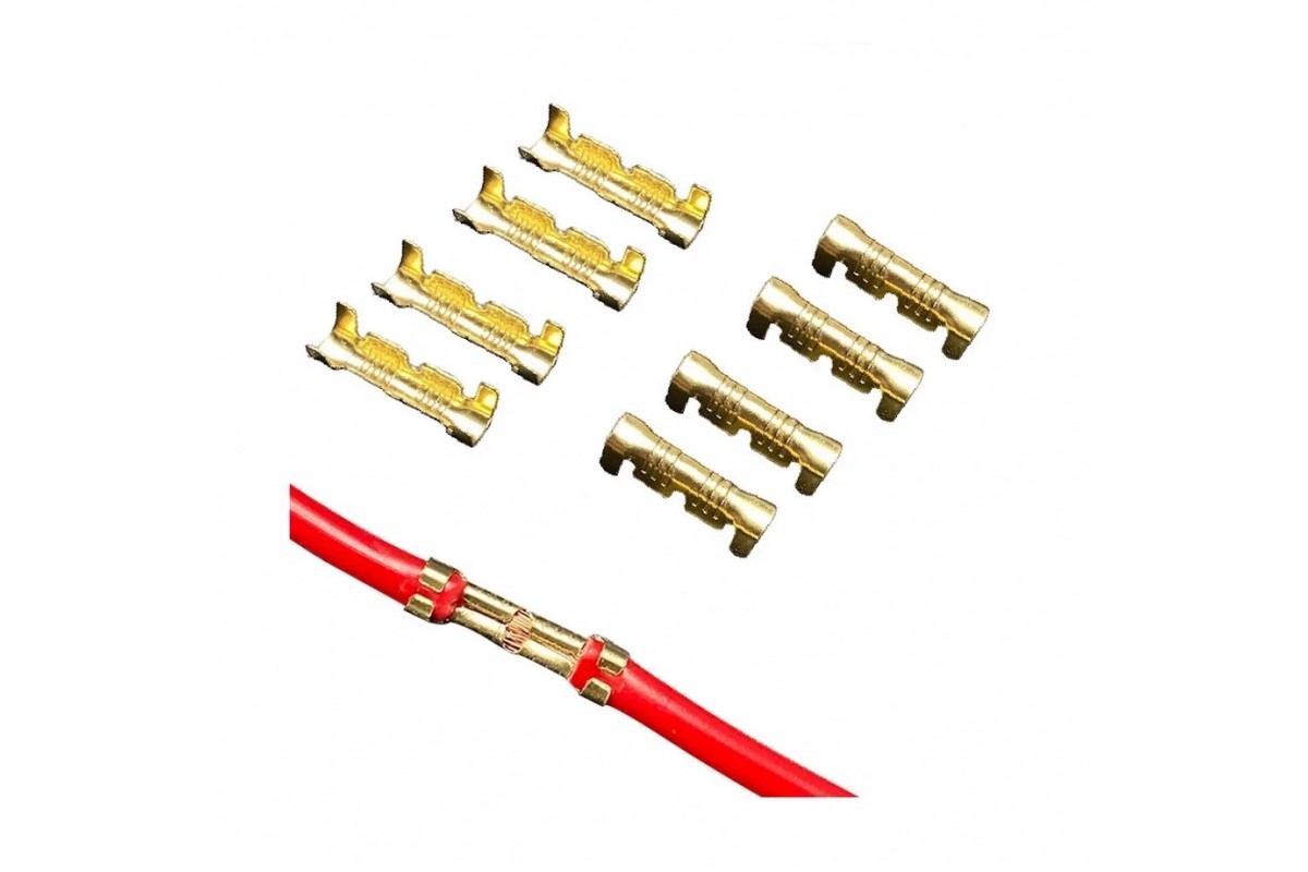 Клеммы для соединения провода U-образные обжимные. В набор входит десять штук клем, десять штук изолирующих колпачков термоусадки. Ширина клеммы 3.0мм, толщина металла 0.2мм, длина 15мм, толщина провода для обжимания не более 2.5мм. Данные клеммы широко распространены в проводке автомобильной и мото, а также в бытовой и другое технике. производитель китай