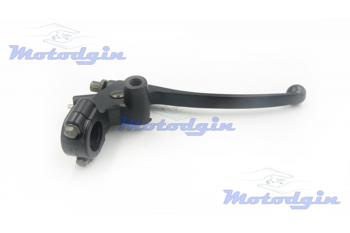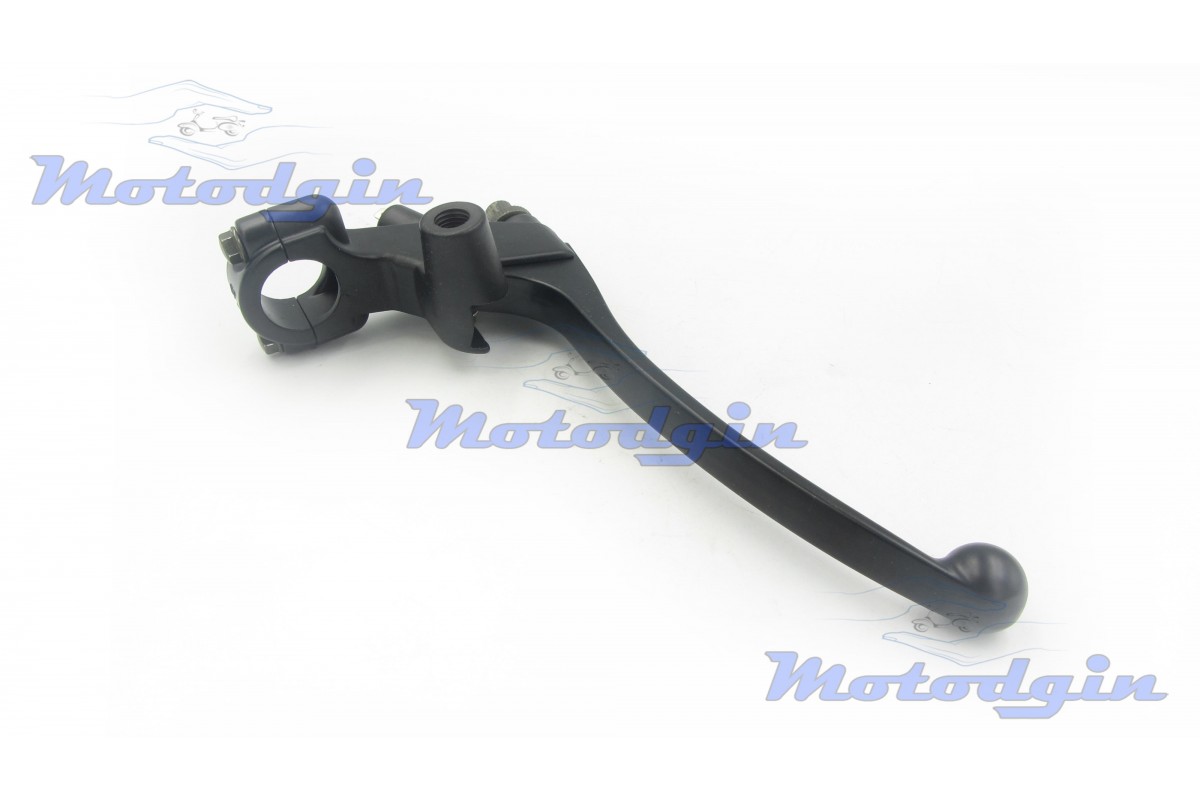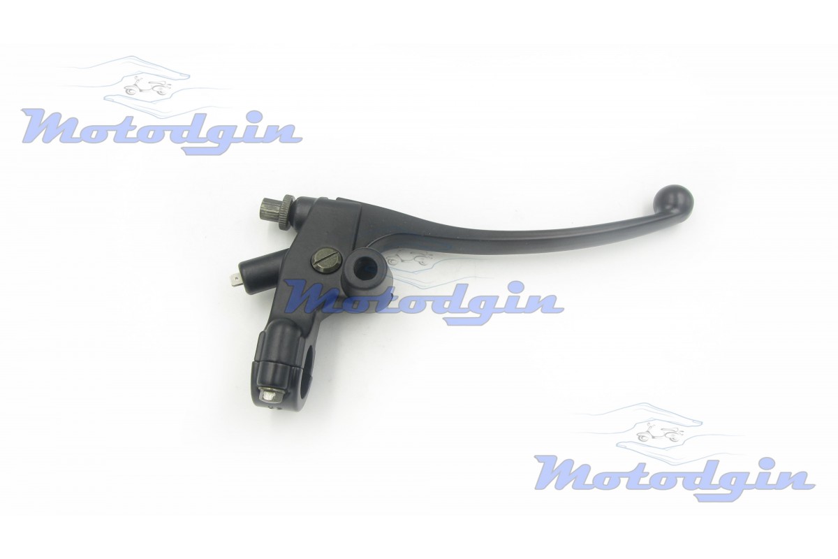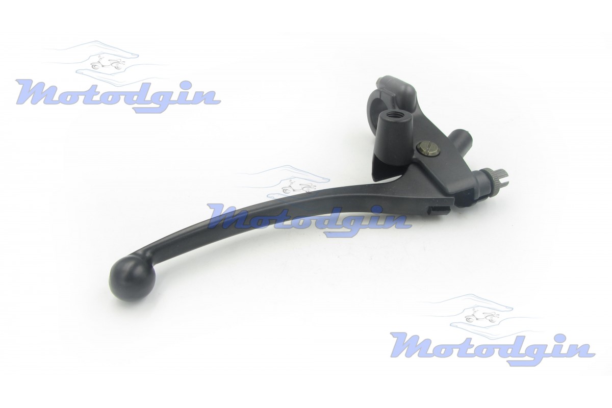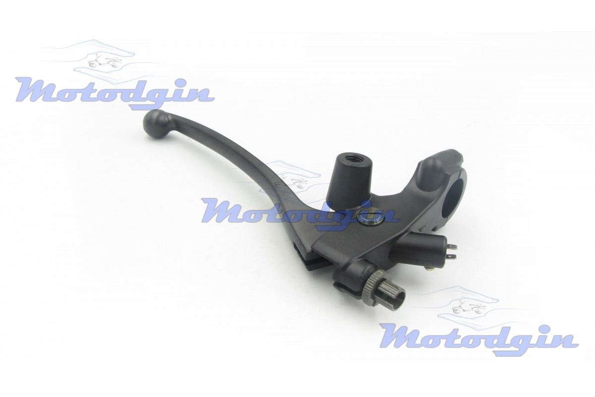 Рычаг руля с креплением под зеркало М10 правый. Правый тормозной рычаг поставляется в комплекте с креплением, датчиком тормоза. Рычаг можно установить на скутер, мопед, мотороллер, квадроцикл и другую мототехнику с диаметром руля не меньше 22мм. Ориентировочные размеры: длина узла 210мм, длина рычага 145мм, диаметр внутренний отверстия хомута 22.0мм, диаметр резьбы под зеркало 10мм. производитель - MG