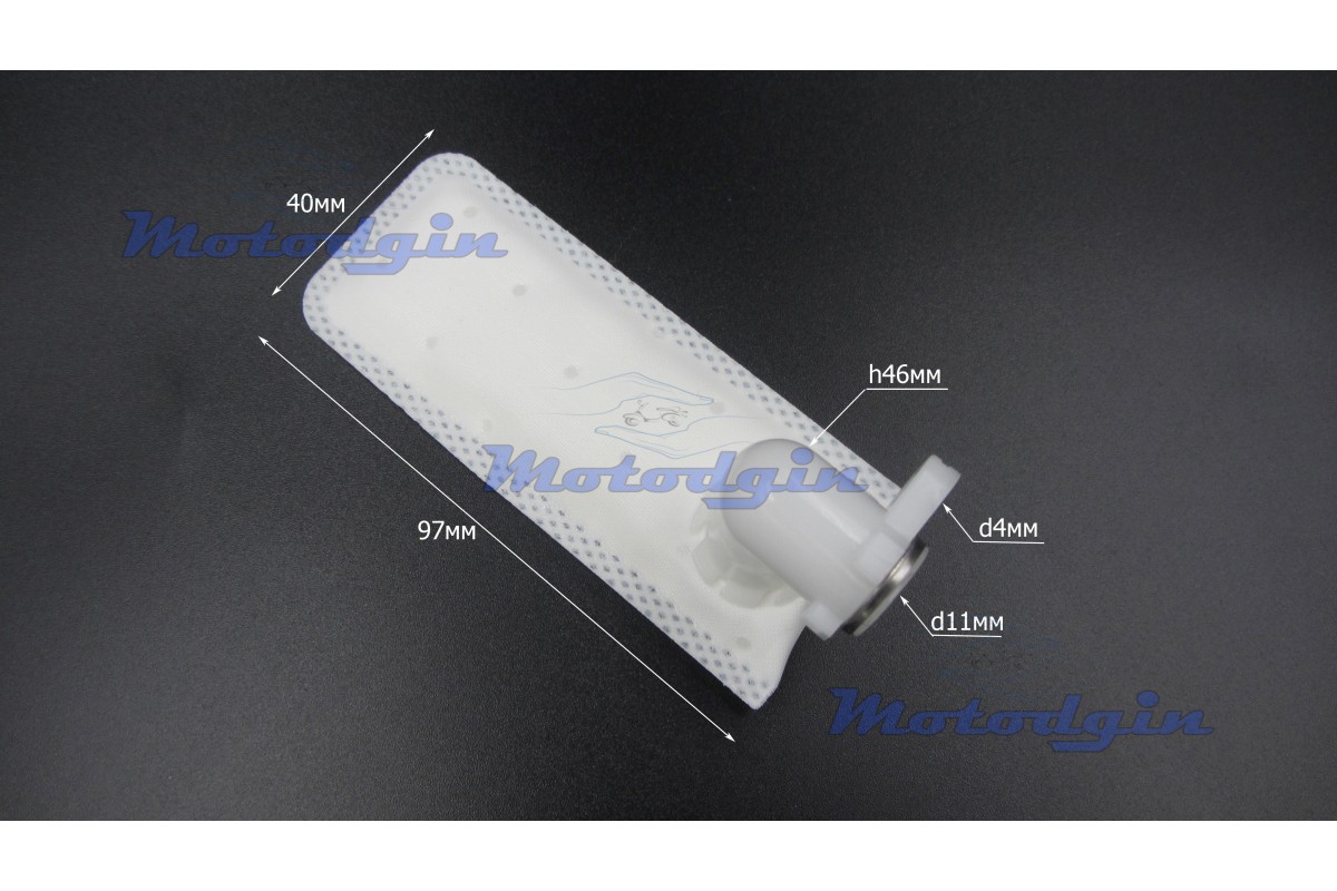 Сетка бензонасоса ( фильтр топливного насоса ) четырехтактного скутера, мопеда, мотороллера, мотоцикла. Топливный фильтр изготовлен в строгом соответствии с оригиналом, с использованием качественных материалов и передовых технологий, размер фильтра 97х40мм, диаметр отверстия для насоса 11мм, для фиксатора 4мм, высота фильтра 46мм. производитель -MG