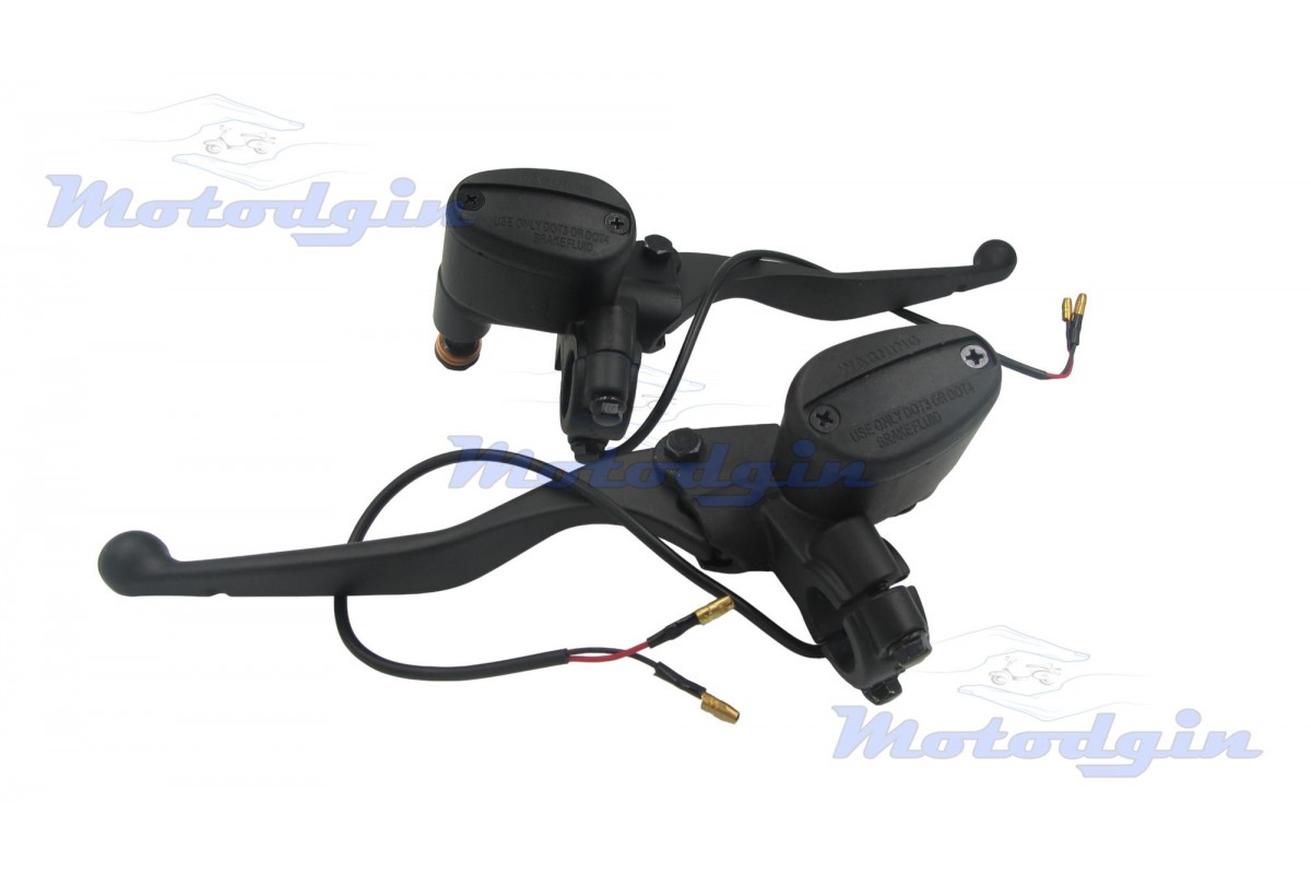 Комплект тормозных машинок (ГТЦ) A8L T90, машинки изготовлены с качественного алюминия, бачок овальный, тормозной штуцер выведен вниз. Размеры ориентировочные: длина гтц 235мм, длина рычага 160мм, диаметр руля минимальный 22мм, бачок 57х37мм. производитель - MG