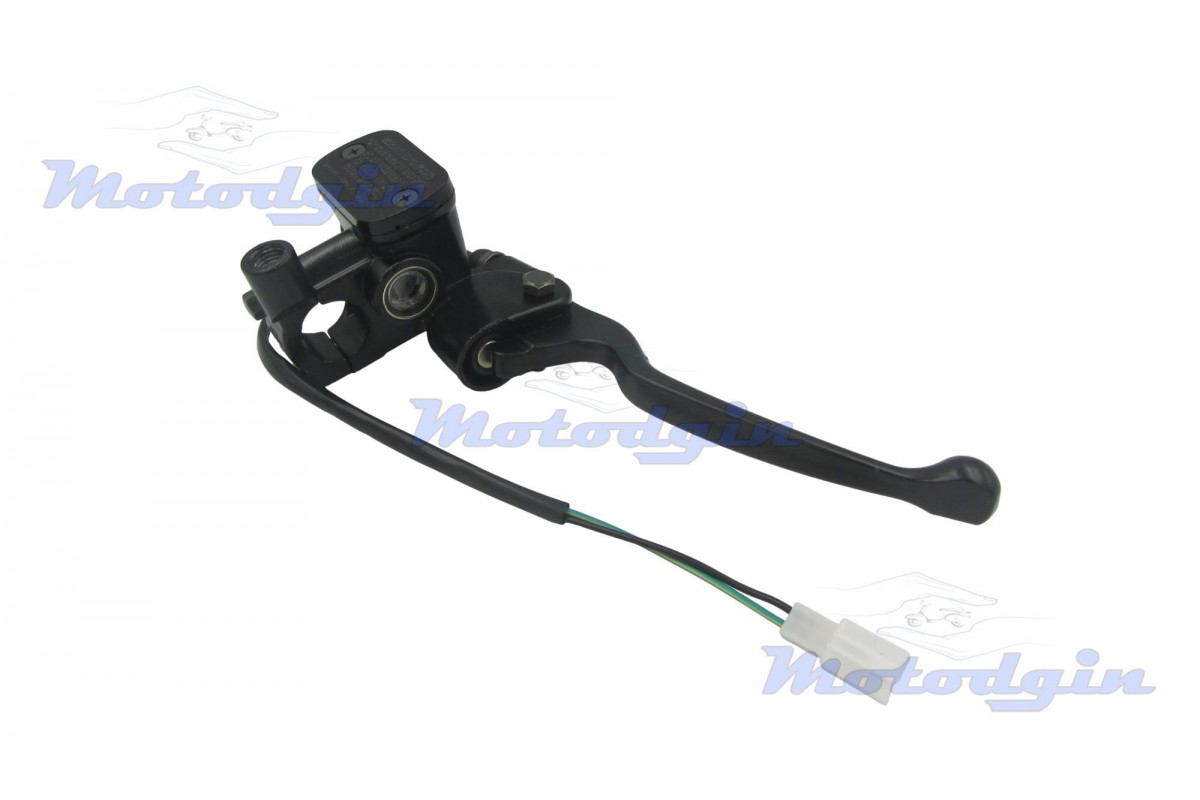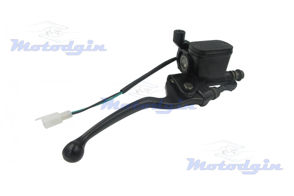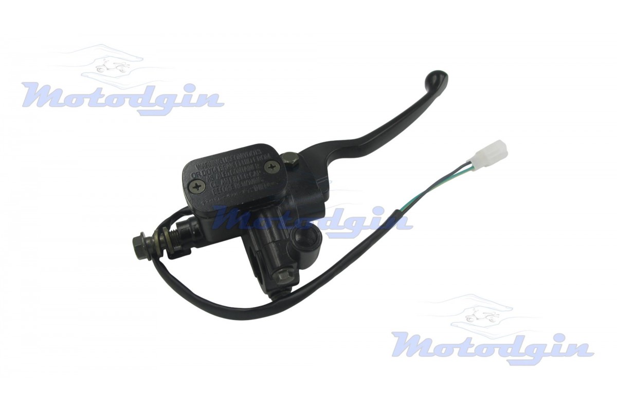 Машинка тормозная (ГТЦ) Pengsh правая черная. Тормозная машинка изготовлена с качественных материалов максимально приближенно к оригиналу. В данной ГТЦ резьба под зеркало левая, диаметр М10, в комплекте поставляется с кнопкой включения стоп сигнала. Хомута крепления рассчитан на диаметр руля от 22мм, длина рычага 150мм, длина провода 340мм, подключение разъем два контакта, тормозной штуцер 10мм.производитель - MG