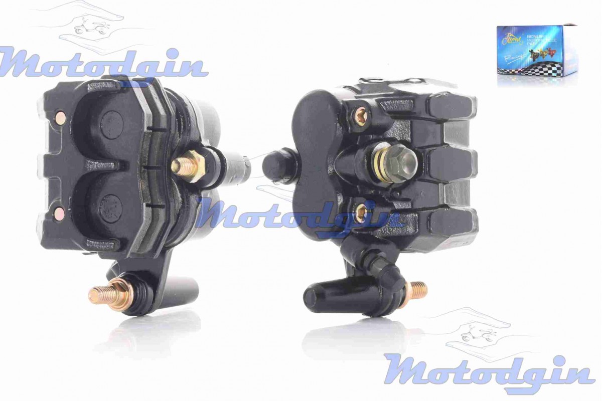 Двухпоршневой тормозной суппорт скутера, применяется на китайских и японских скутерах, а также электрических мопедах. Данный суппорт поставляется без пластины крепления, для его установки необходимо использовать крепление которое установлено на вашем скутере. Суппорт устанавливается на правую сторону, передний либо задний тормозной диск. Расстояние по центрам отверстий ориентировочно 64 - 65мм, диаметр резьбы крепления 8.0мм, колодки без ушей, установка суппорта всегда только штуцером прокачки вверх. Производитель - Китай