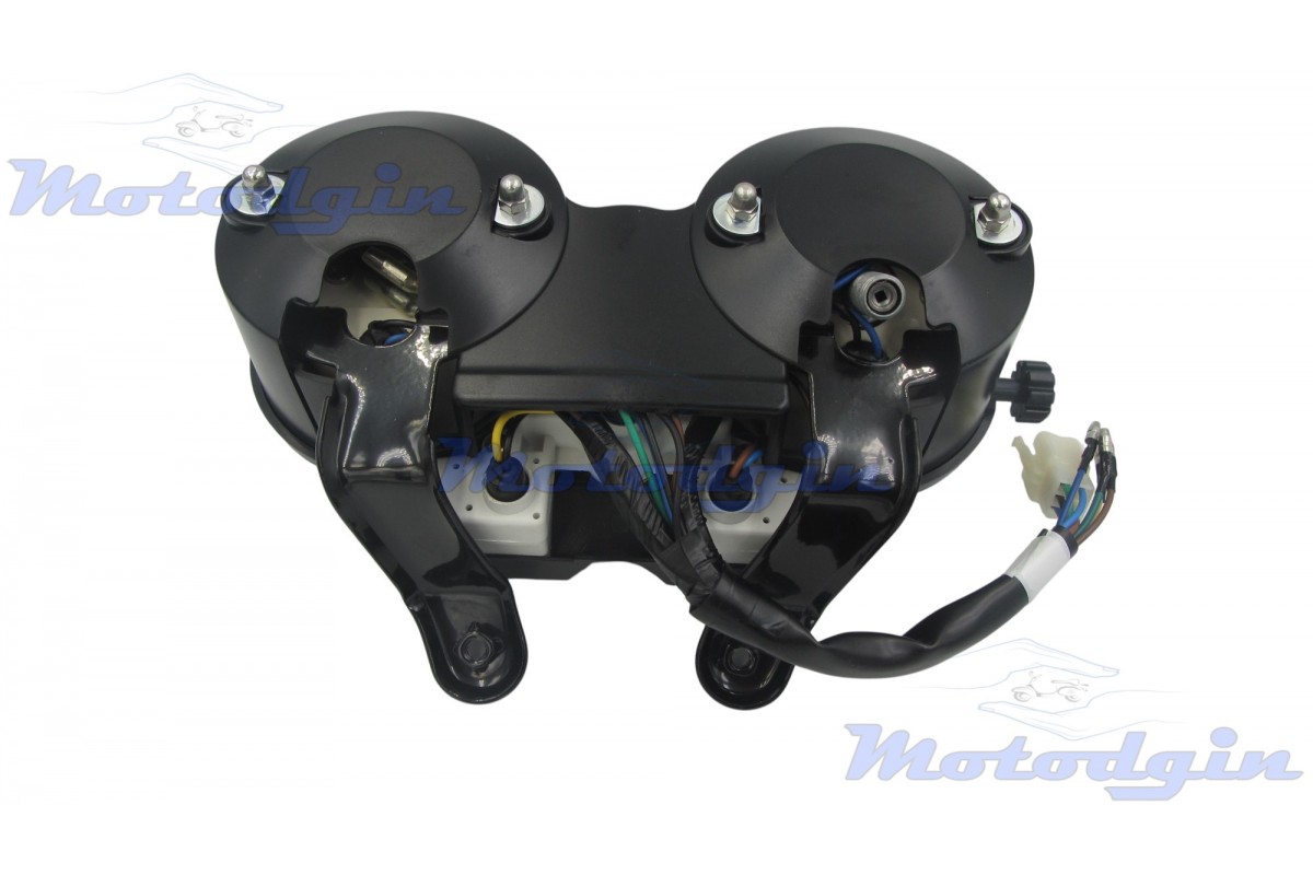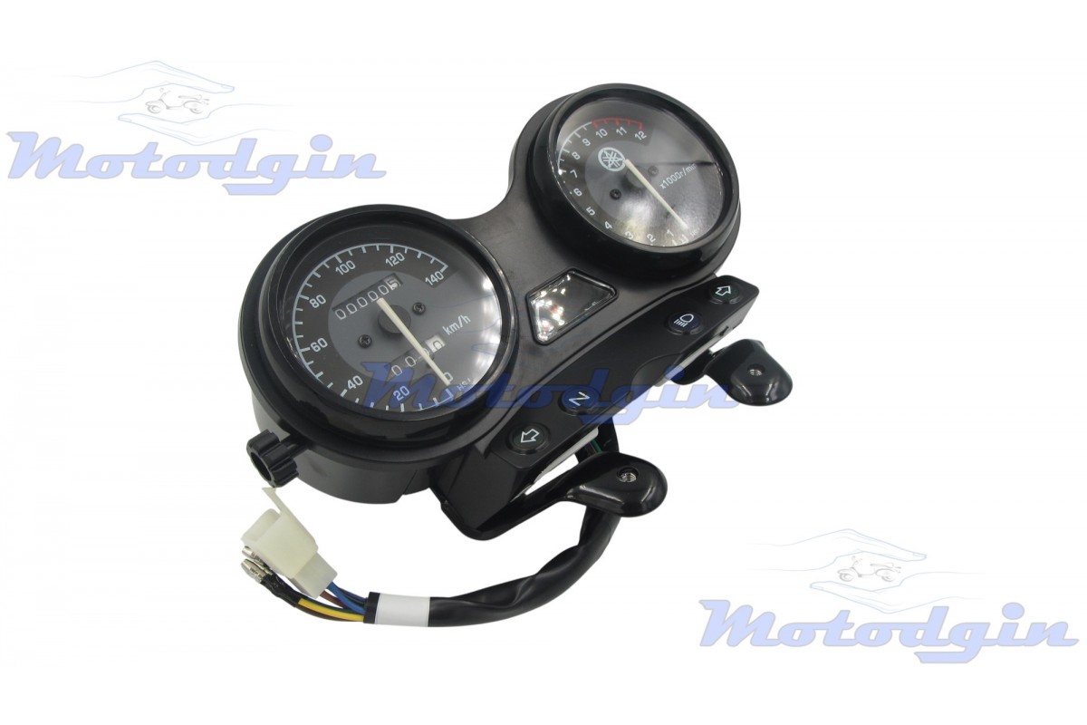 Панель приборов Yamaha YBR125 4 лампы ( Ямаха ЮБР 125 ). Приборная панель для Yamaha YBR 125 (4 лампы) — функциональный элемент управления, отображающий основные показатели мотоцикла. Оснащена четырьмя индикаторами для контроля работы систем, лампа левого поворота, лампа правого поворота, нейтраль, дальний свет, панель имеет четкую шкалу, надежную конструкцию и просто устанавливается на штатные крепления. Подключение разъем пять контактов, и четыре штирьковых контакта. производитель - MG